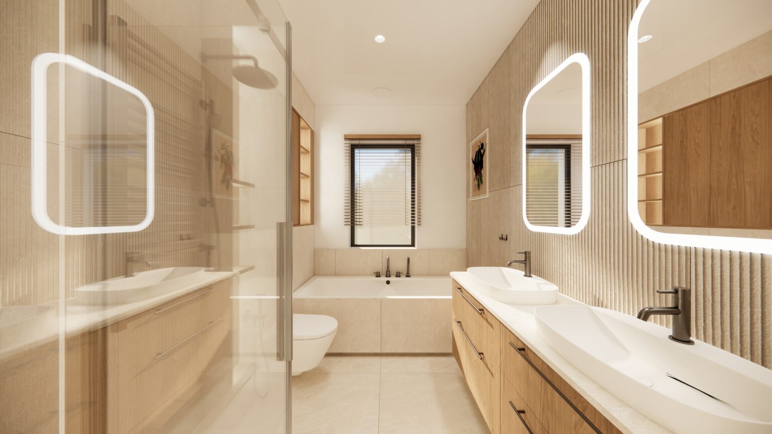 Wnętrza domu pod Poznaniem dla czteroosobowej rodziny. Inwestorom zależało na uzyskaniu harmonijnego, funkcjonalnego wnętrza, bez zbędnych dekoracji. Przestrzeni, która daje spokój i zapewnia komfort użytkowania. Istotnym elementem była kuchnia- ta strefa miała być przede wszystkim funkcjonalna- stąd np. ukryte drzwi do spiżarni, ale też estetyczna- kuchnia płynnie łączy się z salonem, stanowi kontynuację wnętrza. Kolejnym wyzwaniem była jedna z łazienek- tutaj Inwestorzy chcieli uzyskać maksymalną ilość przestrzeni magazynowej, jednocześnie mieszcząc dużą wannę, wygodny prysznic, dużą szafkę z umywalkami i zabudowę meblową nad toaletą. W łazience zastosowano ten sam materiał drewnopodobny co w pozostałej części domu, dzięki czemu uzyskano spójność całego wnętrza.